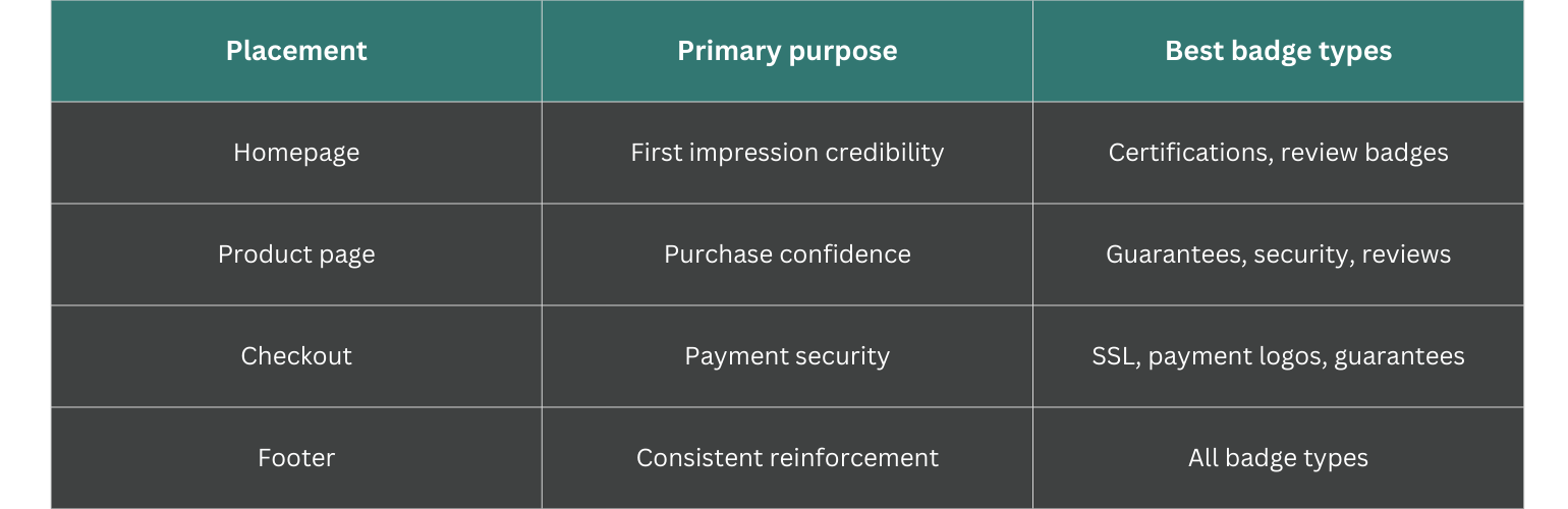 Having badges matters. Where you put them matters more. Placement follows the buyer's journey and addresses hesitation at each step along the way.
