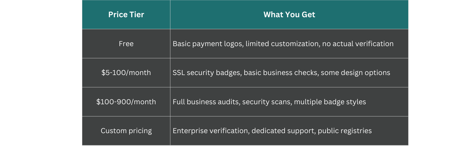Trust badge pricing spans a wide range, from completely free to well over $2000 per month. The price depends on what kind of verification you're getting and who's providing it. Free options typically include basic payment icons or limited app versions with minimal features. Paid plans scale based on your website traffic, how much you can customize the badge, and how thoroughly the provider actually checks your business.