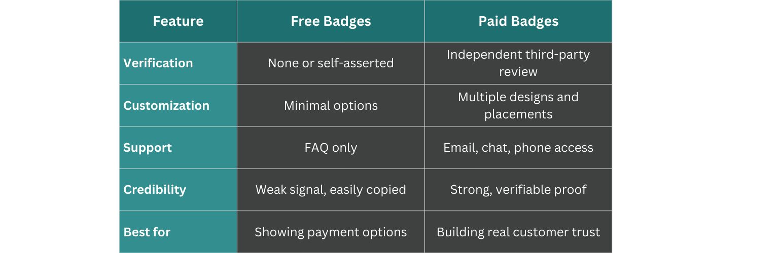 Free badges serve a purpose, yet they have clear limitations that affect how much trust they actually build. Anyone can place a generic security icon on their site, which is precisely why savvy customers look for verified badges instead.