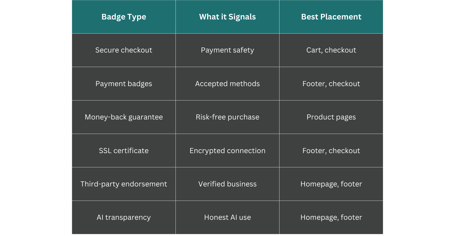 Tip: Start with badges that address your highest-friction points. If cart abandonment is your biggest problem, focus on checkout badges first and expand from there.